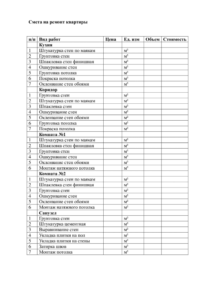 В смету на ремонт квартиры должны быть включены следующие пункты расходов:
